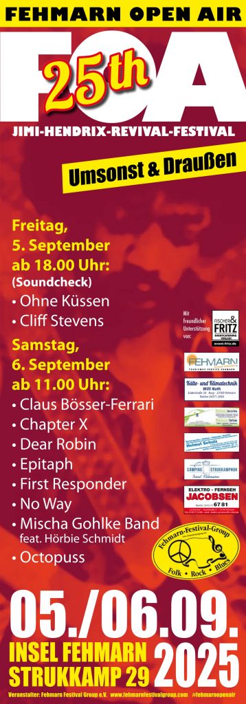 Und schon ist das 25. Fehmarn Open Air wieder Geschichte. Ihr wart ein wunderbares Publikum. Wir haben es wieder geschafft, hervorragende Bands auf unser FOA zu locken. Bis zum nächsten Jahr am 5. September 2026.