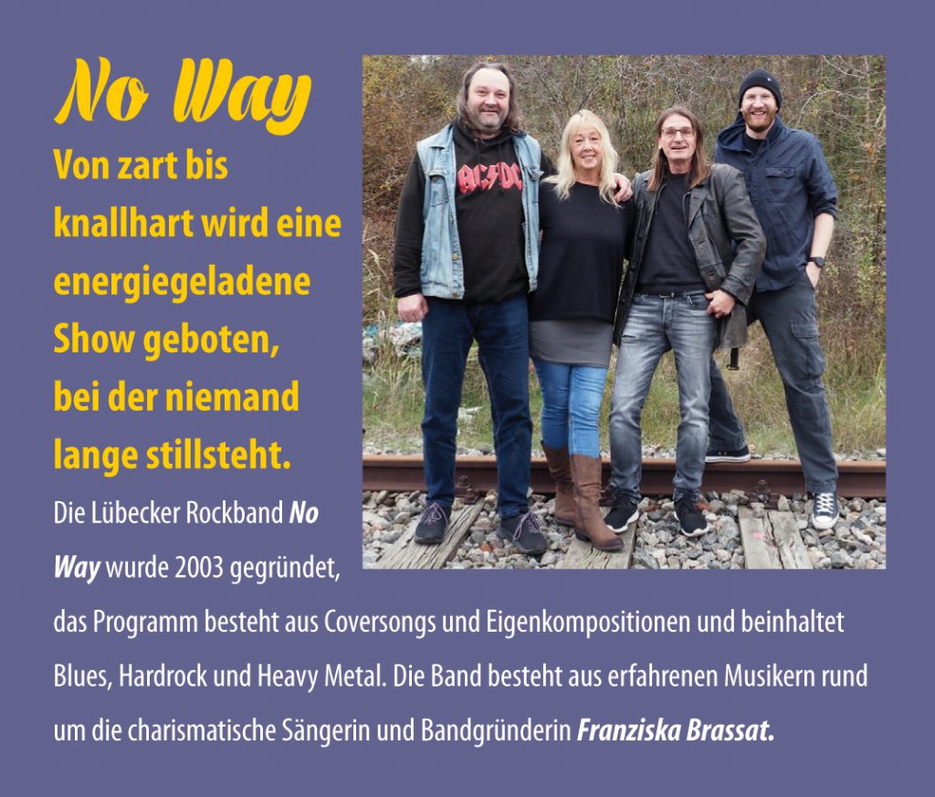 Freiwillige Feuerwehr Süderort bei der Arbeit Stefan und Inge – alle Jahre mit Tatkraft und guter Laune dabei Love & Peace – ein friedliches Get Together bei bestem Wetter Vier Mitglieder der FFG: Dr. Ekkehard Wolf aus Bremen, unser Grafiker Frank Gintarra aus Neukirchen, unser 1. Vorsitzender Werner Feldmann (Marburg/Fehmarn) und unser 2. Vorsitzender Lothar Köhn aus Pötenitz Schon am späten Vormittag war die Bude halbvoll und No Way auf der Bühne Unterstützung (nicht nur) aus Marburg und Altenburg