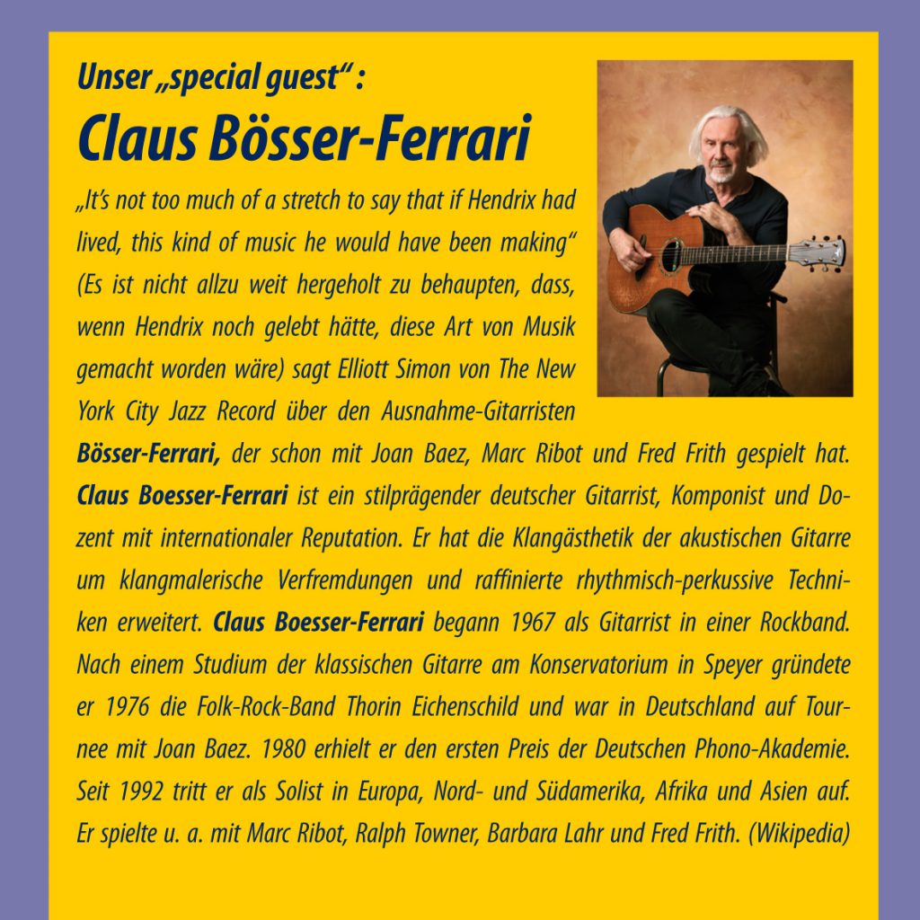 2021 war er mit seiner Band Ape Shifter auf unserem Fehmarn Open Air zu Gast – nun kommt Jeff Aug mit seinem Soloprogramm „Kiss of the Liquid Moon Solo & Instrumental” nach Fehmarn, denn am 7. Februar startet er seine durch rund 40 Städte führende Tournee um 20.00 Uhr im Café Liebevoll in Burg/Fehmarn. Der Eintritt kostet 13.- Euro – für an der zuvor stattfindenden Mitgliederversammlung der Fehmarnfestivalgroup e.V. Teilnehmende ist der Eintritt frei. www.jeffaug.com
